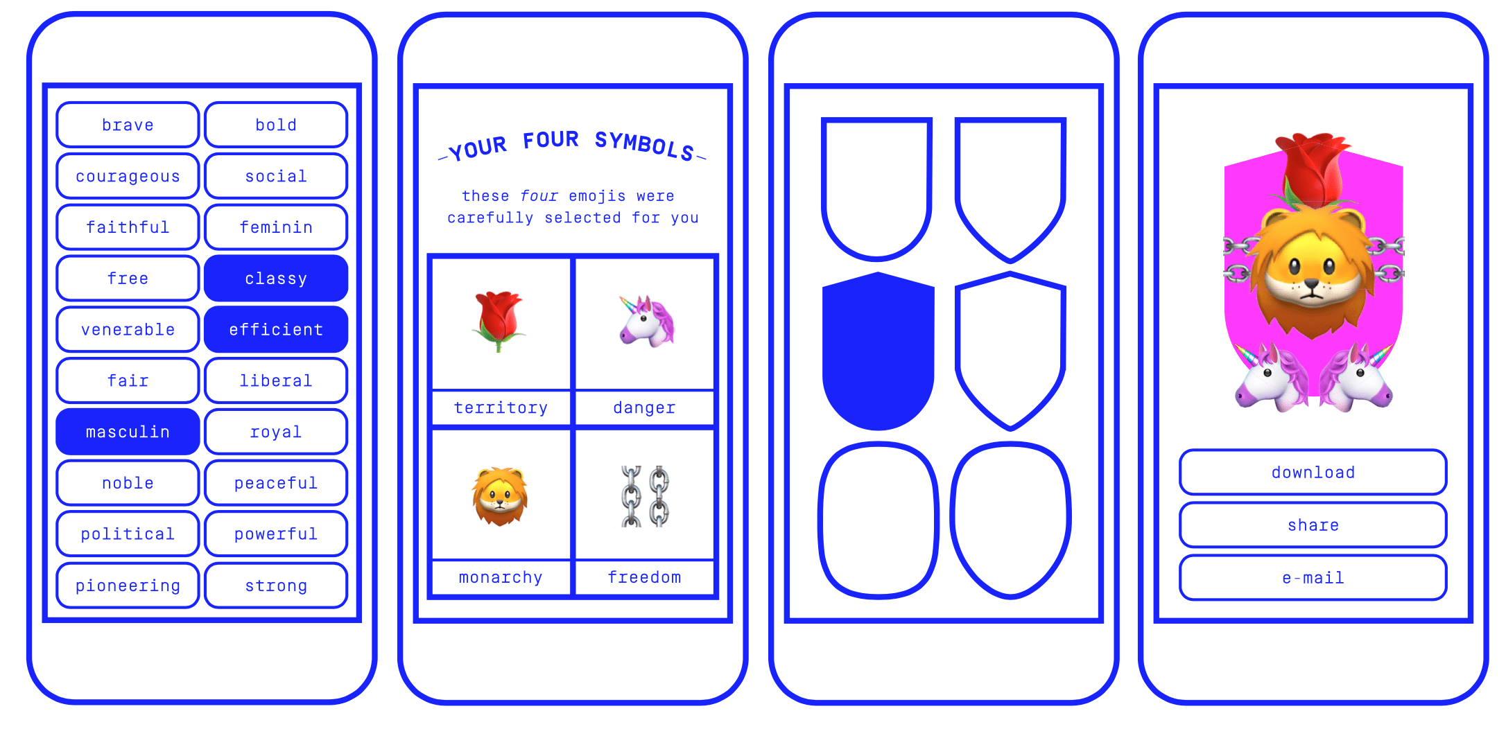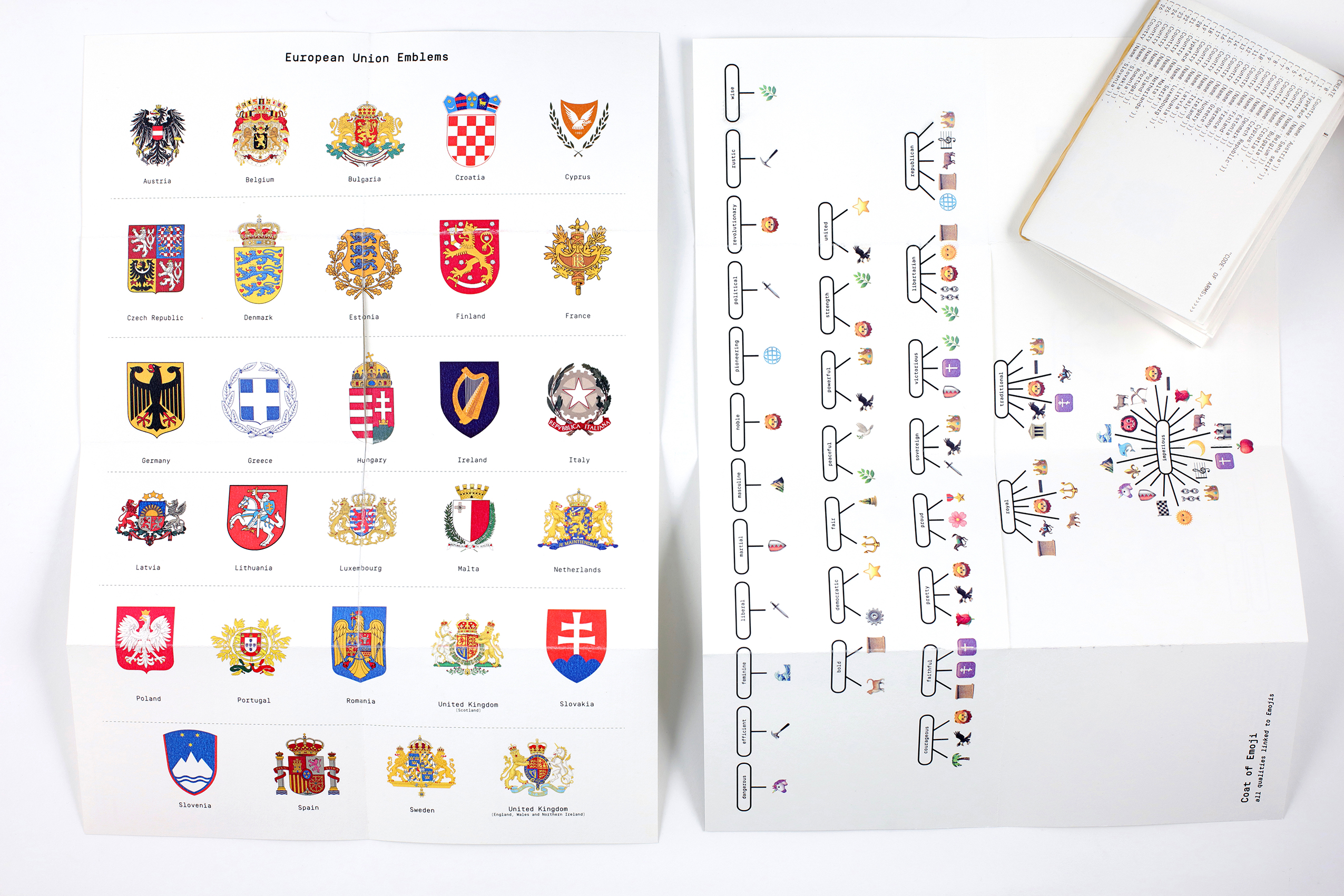 The Coat of Arms of any country symbolises its values, past traditions and beliefs. In today’s hyper-connected world that is slowly isolating itself; in times of Brexit, border conflicts and the refugee crisis, this artefact could prove relevant. Within the zine, the data has been used, to re-interpret the semantics of EU national heraldry using emoji in a series of experiments: A personal emblem generator, “unifying” two nations such as the UK and Ireland, an emblem for the whole of the EU etc. Emojis are the new way of communicating and have the power to popularise and contemporize the subject.